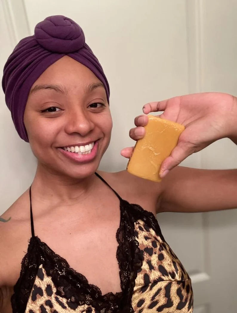 Even with turmeric, this soap rinses off clean and won’t stain your skin or towels — just fresh, glowing skin.